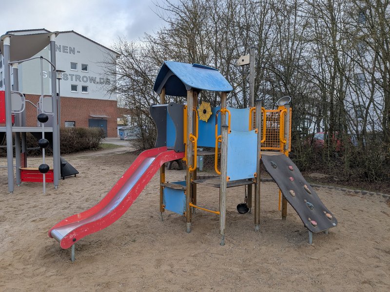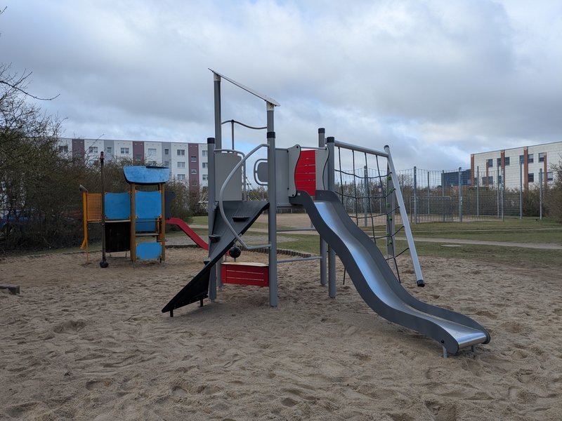 Ausstattung: drehbare Seilpyramide, Sandspielturm mit Rutsche für kleinere Kinder bis 6 Jahre, Spielgerät mit Rutsche für Kinder von 6 bis etwa 12 Jahre, Wipptier, Jugendhütte, Jugendtreff, 2 Kleinfeldtore, 1 Basketballkorb